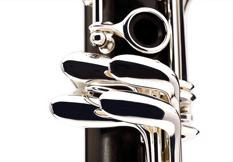 R13 Prestige (银牌)单簧管体现了 R13 系列的设计精髓。其使用的黑黄檀木经过精心挑选,具有良好的声学特性和美观性,并且保持了其天然色泽。精密设计的按键机械装置、以及采用镶嵌金属环的接口配合锻造的镍银按键,确保了这款乐器的坚固可靠。